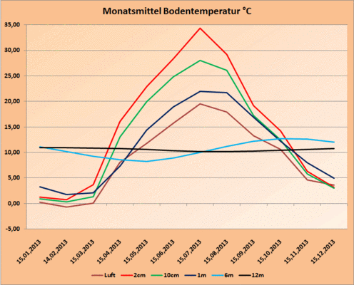 Nach meiner Meinung werden die Temperaturen in 12m Tiefe noch viel stärker als von der Sonne von der Wärme aus dem Erdinnern mitbestimmt, eine Wärme, die von unten nach oben steigt. Je tiefer man bohrt, desto mehr steigt die Temperatur. Das Thermometer in Ihrem Artikel zeigt in 12m Tiefe etwa 10C, also ein Grad mehr als die durchschnittlichen Lufttemperaturen des DWD für Deutschland. Unser Tiefenbrunnen -100m Tiefe- in meinem Heimatort liegt bei 13C.