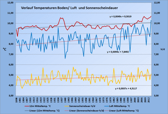 Beim Blick auf den Verlauf der Bodentemperaturen fällt auf, dass der Trend im Zeitraum zwischen 1898 und 1990 – bis auf einen massiven mehrjährigen Peak auf bis zu 10,5 °C in den 30er Jahren – nahezu ohne Anstieg verläuft. Erst ab 1990 ist eine deutliche Trendänderung nach oben festzustellen, doch wurde der Wert von 10,5 °C erst wieder im Jahr 2007 erreicht. Seither verharrt die 12-m-Bodentemperatur auf diesem hohen Niveau.