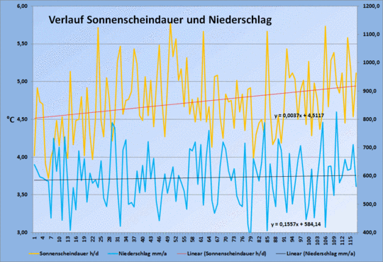 Bild 5. Während die mittlere Sonnenscheindauer in Deutschland den letzten 116 Jahren deutlich zugenommen hat, sind die Niederschlagsmengen nahezu unverändert geblieben (Daten: PIK, Grafik: Autor)