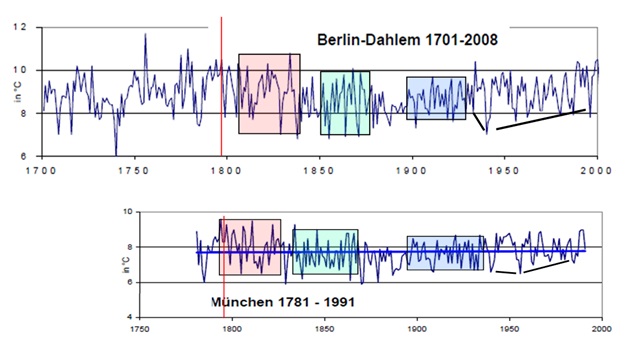 Abb.10 zeigt oben den Temperaturverlauf von Berlin Dahlem und darunter den von München seit dem 18.Jhdt, Quelle, Prof. Ewert. Nach dem Max. im Hauptsonnenzyklus (ca.1797, rote Linie) schwanken die Temperaturen sehr stark und liegen auf vgl. hohem Niveau (rotes Viereck). Genau wie heute. Anschließend ‚beruhigt‘ sich das Wetter und die Temperaturen und die Schwankungsbreite gehen (wegen der nachlassenden solaren Aktivität, blaue Rechtecke) zurück. Genau, wie die Autoren und die NASA* dies auch für die kommenden Jahre erwarten. Das Wetter (Klimageschehen) damals, wie heute, hat nichts mit irgendwelchen sog. Treibhausgasen, wie CO2, zu tun, sondern folgt allein der solaren Aktivität und der sich daraus ergebenen physikalisch-/meteorologischen Prozessen.