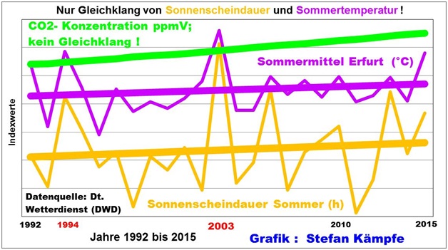 Wie Leistenschneider in seiner 8-teiligen EIKE-Dokumentation "Dynamisches Sonnensystem – die tatsächlichen Hintergründe des Klimawandels" zeigte, basiert die Erwärmung des ausgehenden 20.Jahrhunderts auf der dynamischen Sonne. Solanki et al. konnten nachweisen, dass das Klimasystem der Nordhalbkugel der solaren Aktivität um ca. 11 Jahre nacheilt. In dieser Max-Phase (der Hauptsonnenzyklus, der im Mittel 208-jährige des Vries-Suess-Zyklus und der 35-jährige Brückner-Zyklus hatten 2003, bzw. 2005 ihr Maximum), befinden wir uns temperaturmäßig, so dass der Sommer 2015, mit all seinen Facetten auf die dynamische Sonne zurück zu führen ist.