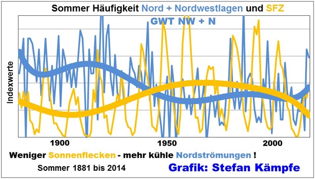 Zum Abschluss möchten die Autoren unseren Lesern zeigen, wie die Sonne die Häufigkeit der Nord und Nordwestwetterlagen, also kühleres Wetter bestimmt (Abb.12).