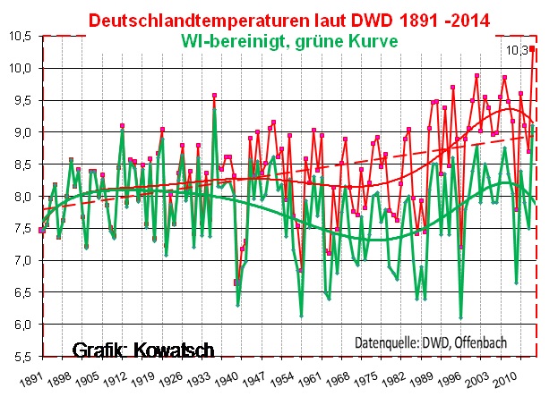 Gleich zweimal purzelten in Deutschland die Allzeitrekorde der Tageshöchsttemperatur und 40,3°C wurden gemessen. Was es mit solchen Vergleichsmessungen auf sich hat, haben die Autoren in ihren Berichten zum Wärmeinseleffekt (WI) bereits mehrfach aufgezeigt. Da die Zeit den Raum verändert und somit alle seine Eigenschaften und eine seiner Eigenschaft ist seine Temperatur, muss für Vergleichsbetrachtungen grundsätzlich der WI heraus gerechnet werden, sonst werden Äpfel mit Birnen verglichen und der WI beträgt für Deutschland derzeit +0,02°C/Jahr. Also +0,2°C in 10 Jahren, wobei er im Sommer infolge der Sonneneinstrahlung etwas höher liegt als im Winter. (Abb.2).