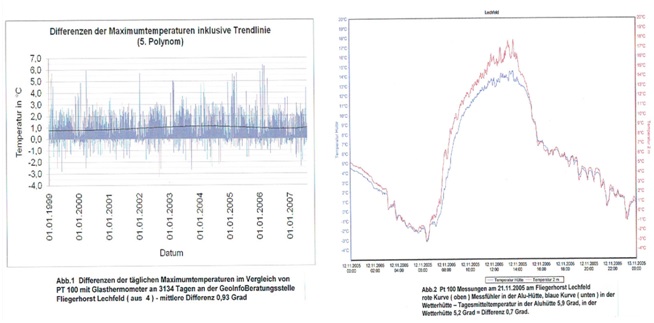 Abb.3 links zeigt, dass Temperaurabweichungen von +5°C und mehr in den Maximaltemperaturen keine Seltenheit sind. Originaltext: “Unterschiedliche tägliche Messwerte bedingt durch alte und neue Sensoren für die Temperaturmessung … An den 3144 Tagen ergab sich eine mittlere Differenz von + 0,93 Grad – Pt 100 höher als Quecksilber. Die maximal erfasste Tagesdifferenz betrug gar 6,4 Grad ! Auch im Tagestemperaturgang (rechts) zeigt sich eine deutliche Abweichung von +3°C bei den heutigen Messungen zu denen vor z.B. 15 Jahren.