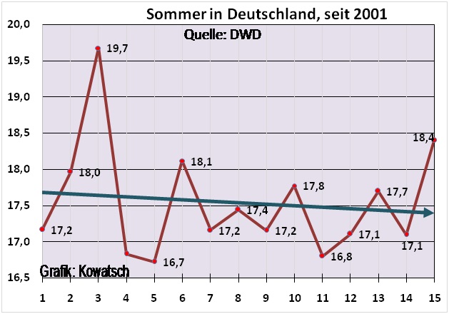 Abb. 4: Seit dem Jahr 2001 haben die drei Sommermonate in Deutschland einen deutlich fallenden Trend. Die Grafik ist nach den Originalangaben des Deutschen Wetterdienstes (DWD) in Offenbach gezeichnet. Die Daten sind nicht WI-bereinigt, sonst wäre der fallende Trend noch stärker.