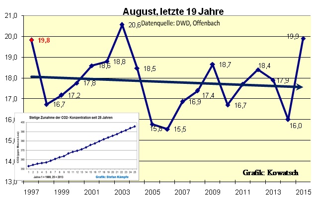 CO2 kann diesen warmen August nicht bewirkt haben, denn wie die kleine eingeblendete Grafik zeigt, sind die Kohlendioxidkonzentrationen der Atmosphäre kontinuierlich steigend. Die beiden Trendlinien in der Abb.5 sind sogar gegenläufig und somit kann Kohlendioxid gar keinen oder keinen nennenswerten Einfluss auf die Temperaturen haben. Wir haben über die letzten 19 Jahre sogar eine negative Korrelation der beiden Größen, was für Treibhausgläubige eigentlich bedeuten müsste: Kohlendioxid kühlt die Luft.
