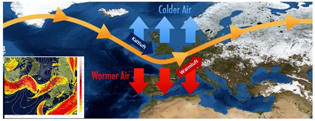 In seinem EIKE-Artikel "Sommerhitze 2015 – Klimawandel oder ’normales‘ Wettergeschehen" hat Leistenschneider dargelegt, dass für unser Wetter in Mitteleuropa der Polar Front Jet (PFJ) eine maßgebliche Rolle spielt. Er steuert die “planetarische Frontalzone“ der gemäßigten Breiten. Hier treffen tropische und polare Luftmassen aufeinander, was sich in einem unruhigen Wettergeschehen widerspiegelt. Der PFJ mäandriert mal mehr, mal weniger stark und weist Wellen mit unterschiedlichen Wellenlängen auf, die so genannten Rossby-Wellen und verläuft um den ganzen Globus. Er bildet die barokline Übergangszone zwischen Warm- und Kaltluft. Die Luftmassen können nicht einfach quer über diesen Jetstream hinweg strömen. Eine Vermischung der Luftmassen findet nicht statt. Er hält also die kalte Polarluft von uns fern (Abb.6).