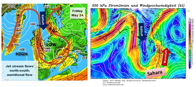 Abb.8 zeigt einen über Europa ausgebildeten breitgefächerten PFJ. An seinem Verlauf wird die warme Sahara-Luft direkt nach Deutschland geführt und, sobald der PFJ (=Rossby-Welle) weiter gezogen ist, kalte Luft direkt aus Island, bzw. Nordskandinavien auf direktem Wege nach Deutschland strömt. Quelle: www.wetterzentrale.de
