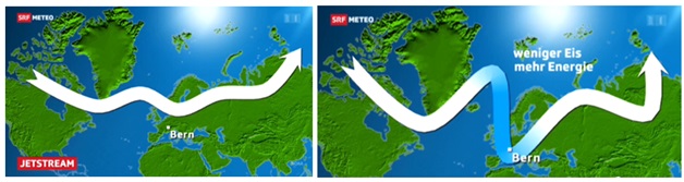 Wie das schweizerische Fernsehen in seiner Sendung SRF Meteo – Wie der Jetstream das Wetter beeinflusst trefflich darlegte, verursachen schwächere Temperaturunterschiede im Winter für unser Wetter genau das Gegenteil: Die Winter sind kühler und ggf. länger (Abb.9).