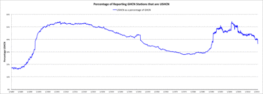 Prozentzahl der Stationen im GHCN, die aus dem USHCN stammen
