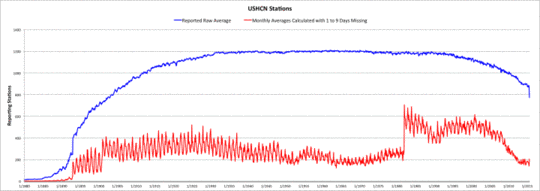 Die folgende Graphik zeigt die Anzahl der Daten, in in der USHCN-Aufzeichnung für jeden Monat von Januar 1880 bis heute verfügbar sind. Auf der Y-Achse ist die Anzahl der Daten liefernden Stationen aufgetragen, so dass jeder Punkt auf der blauen Kurve die Anzahl der Monate repräsentiert, in denen das Monatsmittel aus unvollständigen täglichen Temperaturmessungen berechnet worden ist. USHCN berechnet einen monatlichen Mittelwert auch bei bis zu neun fehlenden Tagen und kennzeichnet den Monat mit einer Rangfolge von „a“ (1 fehlender Tag) bis zu „i“ (neun fehlende Tage). Wie man in der Graphik erkennt, wurden etwa 25% der monatlichen Werte berechnet, wenn einige Tage fehlen. Das offensichtlich jahreszeitliche Verhalten der roten Kurve verlangt nach weiteren Untersuchungen.