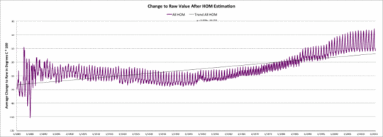 Die sechste Graphik zeigt die mittlere Änderung der Rohwerte infolge des Homogenisierungs-Modells. Die Kurve schließt alle Schätzungen ein, einschließlich des 1% aller Werte, in denen der homogenisierte Wert gleich ist dem Rohdatenwert.