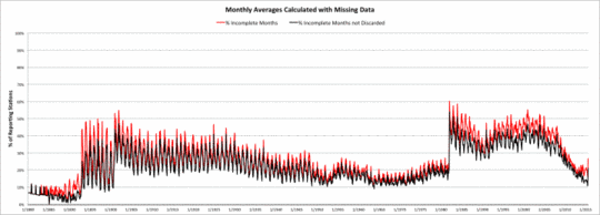 Wie zuvor beschrieben berechnet das USHCN ein monatliches Mittel, falls bis zu neun Tage mit Daten fehlen. Die folgende Graphik zeigt die Prozentzahl der Monate, in der die Aufzeichnung unvollständig ist (rote Kurve) sowie die Prozentzahl der Monate, die erhalten bleiben, nachdem man die Adjustierungs-Modelle angewendet hatte (schwarze Kurve). Es ist offensichtlich, dass unvollständige Monate nicht oft ausgesondert wurden.