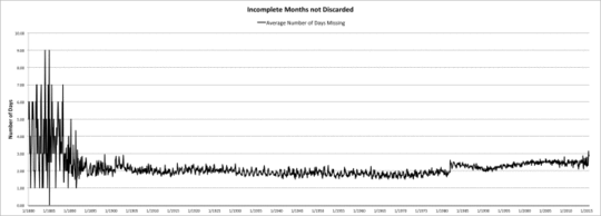 Die nächste Graphik zeigt die mittlere Anzahl von Tagen, die fehlten, als die täglichen Aufzeichnungen der Monate unvollständig waren. Nach einer gewissen Volatilität vor dem Jahr 1900 beträgt die mittlere Anzahl fehlender Tage in unvollständigen Monaten zwei (6,5%).