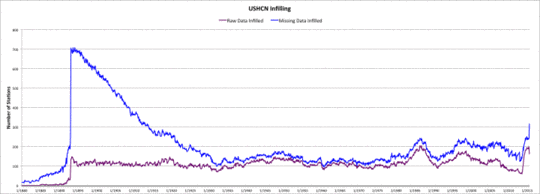 Die USHCN-Modelle erzeugen Schätzungen für einige fehlende Monate und ersetzen gelegentlich einen kompletten Monat durch eine Schätzung, falls es zu viele Inhomogenitäten gibt. Die letzte Graphik zeigt die Häufigkeit, mit der dies in der USHCN-Aufzeichnung vorkommt. Die blaue Kurve zeigt die Anzahl der nicht existierenden Messungen, die durch den Auffüllungsprozess geschätzt worden sind. Die violette Linie zeigt die Anzahl bestehender Messungen, die ausgesondert und durch den Auffüllungsprozess ersetzt worden sind. Vor dem Jahr 1920 kam es sehr häufig zur Schätzung fehlender Daten. Seitdem ist es öfter zur Ersetzung fehlender Daten gekommen, als dass fehlende Daten geschätzt worden sind.
