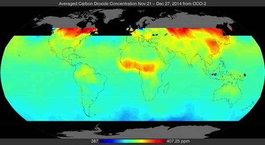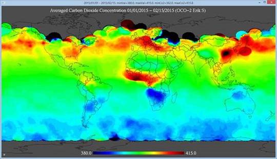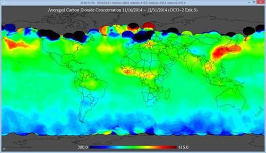 Abbildung 2: von der NASA gezeigte OCO-2-Daten vom 21. November bis 27. Dezember 2014. Quelle: http://www.nasa.gov/sites/default/files/thumbnails/image/mainco2mappia18934.jpg