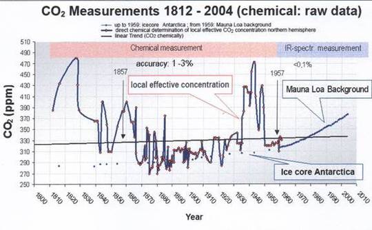Allein die Tatsache, daß der IPCC als Anschlußwert an die Werte der Eisbohrkerne eine französische Messung nimmt, die den passenden Wert von 280 ppmV liefert ohne zu berücksichtigen, daß alle französischen Messungen der damaligen Zeit unter zu Hilfe nahme von konz. Schwefelsäure durchgeführt wurden, die aber selbst mindestens 20 ppmV absorbiert. Das wurde bei dem Wert von 280 ppmV nicht berücksichtigt. Das spricht eindeutig für sich selber.