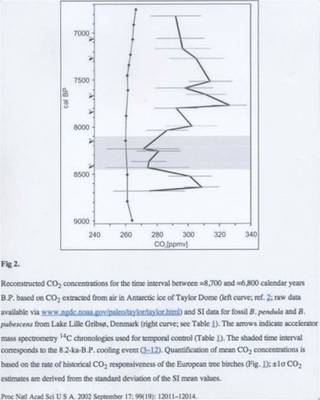 Die Vorstellung eines geringen vorindustriellen CO2-Niveaus in der Atmosphäre auf der Grundlage so geringen Wissens wurde zu einem weithin akzeptierten Heiligen Gral der Klimaerwärmungs-Modelle. Die Modellierer ignorierten die Beweise aus direkten Messungen von CO2 in der Luft, die zeigen, dass dessen mittlere Konzentration im 19. Jahrhundert 335 ppmv betragen hatte (Abbildung 2).Die eingekreisten Werte in Abbildung 2 zeigen eine verzerrte Auswahl von Daten um zu zeigen, dass das CO2-Niveau im 19. Jahrhundert nur 292 ppmv betragen hatte. Eine Untersuchung von Stomata-Häufigkeiten in fossilem Laub aus Ablagerungen in einem holozänen See in Dänemark zeigen, dass das atmosphärische CO2-Niveau vor 9400 Jahren 333 ppmv betragen hatte und vor 9600 Jahren 348 ppmv. Dies falsifiziert das Konzept einer stabilen und geringen CO2-Konzentration bis zum Aufkommen der industriellen Revolution.