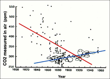 Die Punkte repräsentieren die Messungen des atmosphärischen CO2′ während des 19.Jahrhunderts durch Wissenschaftler mittels rigider Verfahren und gut dokumentierter Instrumentation. Die Objektive der Messungen, begonnen im Jahre 1812, hatte nichts mit Klima zu tun. Vielmehr wollte man die einzelnen Gase der Atmosphäre bestimmen. Damit wurde die Arbeit von Joseph Priestly fortgesetzt, der – obgleich nicht der Erste, der den Sauerstoff entdeckt hatte – der Erste mit veröffentlichten Studien war (1774): Abbildung 6 zeigt die Testmengen, die Callendar ausgewählt hatte (cherry picked), um sein geringes vorindustrielles CO2-Niveau zu behaupten. Was genauso bedeutend ist: Er änderte die Neigung von einem abnehmenden hin zu einem zunehmenden Trend. Abbildung 4 zeigt die gleichen Daten des 19. Jahrhunderts im Vergleich zum Eisbohrkern und den Verläufen am Mauna Loa.