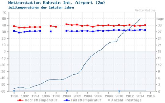 „…im Temperaturverlauf der Julitemperatur von Bahrein welches sich mitten im Zentrum des Persischen Golfes befindet, lässt sich rein gar nichts vom in der Studie vorhergesagten Temperaturanstieg erkennen.“