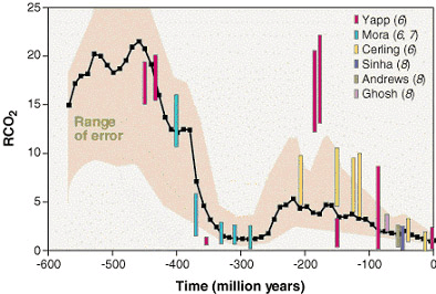 Bild 3. Verlauf des CO2-Gehalts im Verlauf der letzten 550 Millionen Jahre im Verhältnis zum vorindustriellen Niveau von rund 300 ppm (RCO2 = Vielfaches des vorindustriellen Wertes von 300 ppm) (Bild: [CALU])
