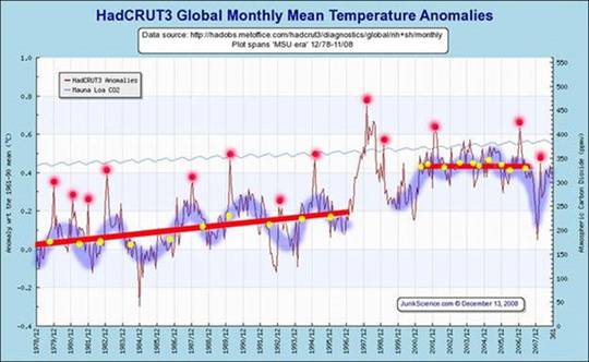 Abbildung 2: HadCRUT-Temperaturdaten des Jahres 2008. Anstatt eines Stillstandes wie in Abbildung 1 zeigt sie links eine fiktive Erwärmung zum Ende des 20. Jahrhunderts. Scharfe Spitzen, markiert mit roten Ballonen, sind Rauschen, erzeugt durch das Computer-Processing. Diese Erwärmung und die Spitzen sind in allen drei oben erwähnten Datensätzen identisch. Man beachte zwei Rausch-Spitzen um den Super-El-Nino.