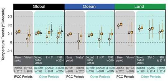 Und jetzt wollen wir uns einigen unmöglichen Behauptungen dieser Studie zuwenden. Ihre Grundbehauptung scheint zu sein, dass jene Erwärmung im 21. Jahrhundert stattgefunden hatte dank der Zunahme der Wassertemperatur (SST), die von der NOAA aufgezeichnet worden ist. Was sie auslassen ist zu zeigen, dass diese Erwärmung den Stillstand aufteilte in eine Erwärmungsrate wie der in Abbildung 2. Außerdem sehen wir auch, dass sich gleichzeitig die Meeresoberfläche erwärmte. Ihre Festlands-Temperaturen folgten dem nicht. Da sich das Festland nicht erwärmt hat, bin ich jetzt verwirrt darüber, warum sie glauben, dass die SST etwas mit dem Stillstand zu tun hat. Die Präsentation von nur zwei Datenpunkten, die zwar legitim sind, aber nicht im Zusammenhang stehen mit einem progressiven Temperaturanstieg sagt uns nichts darüber, welche Art von Erwärmung wo stattgefunden hatte. Falls man die Existenz eines Stillstandes auslöschen will, muss man zeigen, dass diese Daten einen progressiven Temperaturanstieg zeigen, wie es bei HadCRUT3 in Abbildung 2 der Fall ist. Die Leute bei HadCRUT3 haben dieses Prinzip verstanden, als sie ihre in Abbildung 2 gezeigte angebliche Erwärmung erzeugt haben. Kein Zweifel – genauso muss man einen Stillstand durch Erwärmung ersetzen. Unglücklicherweise wissen Karl et al. dies einfach nicht. Sie stellen eine allgemeine Erwärmung in den Raum und haben keine Ahnung, woher sie kommt. So etwas wie Abbildung 2 ist ein sine qua non, um einen Stillstand auszulöschen. Aber sie haben nur zwei legitimierte Datenpunkte, um die Erwärmung zu zeigen, und diese zeigen lediglich eine Erwärmung der Wasseroberfläche. Schaut man noch genauer hin, ist alles sogar noch viel schlimmer. Diese beiden Datenpunkte überlappen sich zeitlich total: der eine mit „21st C“ markierte Punkt liegt zeitlich vollständig innerhalb des mit „1998 bis 2014“ gekennzeichneten Punktes. Das bedeutet, dass es nur einen einzigen legitimierten Datenpunkt in der gesamten Studie gibt. Er ist auch nicht lokalisiert, erstreckt sich über einen Zeitraum von 16 Jahren und macht es weitgehend unmöglich zu sagen, ob irgendein Erwärmungstrend existiert oder nicht. Mit diesen Fakten im Hinterkopf muss ich leider sagen, dass der Sinn dieser Studie nicht gezeigt worden ist. Die Autoren, Herausgeber und Begutachter dieser Studie haben allesamt eine totale Ignoranz des Themas an den Tag gelegt, dass sie anzugehen versucht haben. Es bedarf eines konzertierten Prozesses, derartigen Müll zu veröffentlichen und darauf aufbauend eine weltweite Kampagne zu starten, um das falsche Konzept einer anthropogenen globalen Erwärmung zu befeuern.