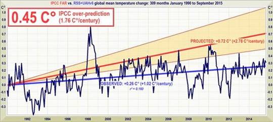Abbildung 2: Projektionen der Erwärmung in naher Zukunft mit einer Rate äquivalent zu 2,8 (1,9; 4,2) K, erstellt mit „substantiellem Vertrauen“ vom IPCC (1990) für die 309 Monate von Januar 1990 bis September 2015 (orangefarbener Bereich und rote Trendlinie) im Vergleich zu den gemessenen Anomalien (dunkelblau) und Trend (hellblau) mit einem Äquivalent von nur 1,02 K pro Jahrhundert, gebildet aus dem Mittel der via Satellit gemessenen Anomalien UAH und RSS in der unteren Troposphäre.