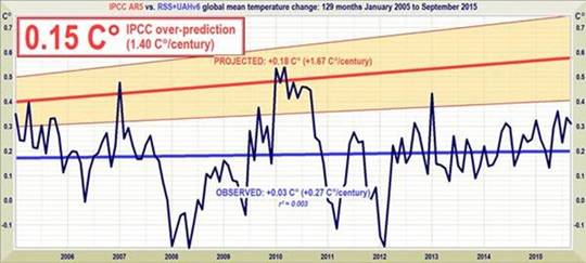 Abbildung 3: Prophezeite Temperaturänderung von Januar 2005 bis September 2015 mit einer Rate äquivalent zu 1,7 )1,0: 2,3) °C pro Jahrhundert (orangefarbene Zone mit dicker roter Best-Estimate-Trendlinie) im Vergleich zu den bei Null liegenden gemessenen Anomalien (dunkelblau) und Trend in der realen Welt (hellblau) als Mittel der von RSS und UAH aufgezeichneten Temperaturanomalien der unteren Troposphäre.