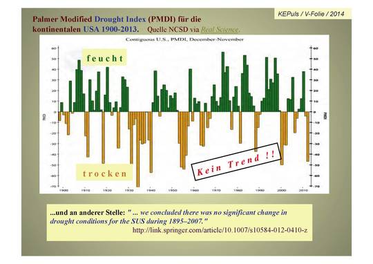 „Zusammenfassend kommt die aktuelle Bewertung zu dem Schluß, daß es zur Zeit nicht genug Hinweise und [nur] ein geringes Vertrauen in einen beobachteten globalen Trend an Dürre oder Trockenheit (Mangel an Niederschlägen) gibt, aus Mangel an direkten Beobachtungen in der Mitte des 20. Jahrhunderts, geographischer Inkonsistenzen in den Trends und Abhängigkeiten der abgeleiteten Trends auf der Indexauswahl. Auf der Basis aktualisierter Studien waren die AR4-Schlußfolgerungen (Anm.: 2007) bezüglich global zunehmender Trends an Dürre seit den 1970er Jahren wahrscheinlich übertrieben. Es ist jedoch wahrscheinlich, daß die Häufigkeit und Intensität von Dürre im Mittelmeerraum und Westafrika sich erhöhen könnte und im Zentrum von Nordamerika und Nordwest-Australien seit 1950 abnehmen könnte.“