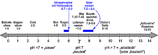 Bild 6. Die pH-Skala mit Angaben zur natürlichen Variabilität von Mineralwasser und Meerwasser (Grafik: Steiner [STEI])