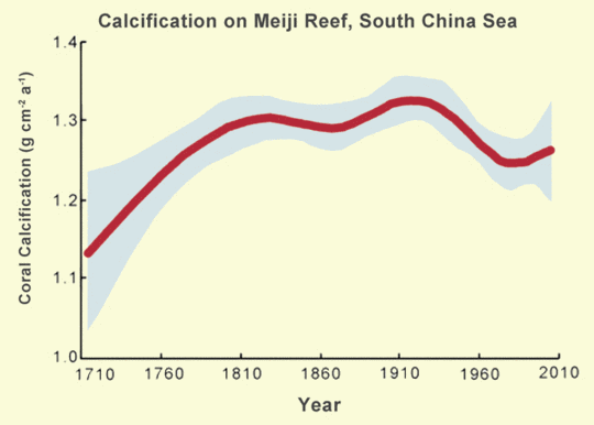 Beispiel hierfür sind Untersuchungen von Q. Shi et al. zu den Bildungsraten von Korallen-Kalkschalen im südchinesischen Meer über einen Zeitraum von 300 Jahren[SHIQ]. Hierbei wurde festgestellt, dass diese im Zeitraum von etwa 1710 bis etwa 1760 – also eindeutig in vorindustrieller Zeit mit deutlich niedrigerem CO2-Gehalt als heute – tiefer lagen als heute und zunächst bis etwa 1810 deutlich anstiegen, um ab 1920 wieder abzusinken, Bild 7. Im Zeitraum ab ca. 1985 – der sich in etwa mit dem von Bild 4 deckt – kam es sogar trotz markant steigender CO2-Gehalte bzw. sinkender pH-Werte zu einem ausgeprägten Wiederanstieg des Schalenwachstums.