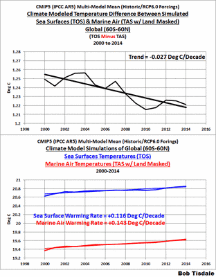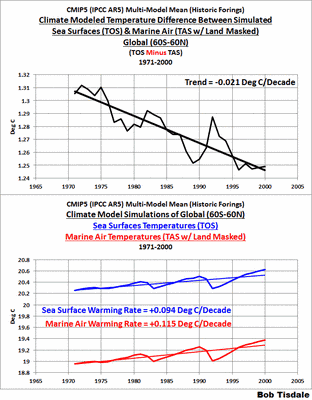 Es ist keine große Überraschung, dass das Multimodell-Mittel in der oberen Graphik der Abbildung 4 einen Rückgang der Temperaturdifferenz zeigen zwischen den Wasser- und den maritimen Lufttemperaturen. Tatsächlich ist der Trend von -0,027°C pro Dekade der modellierten Temperaturdifferenz vergleichbar mit der Adjustierung der Schiffsdaten von 0,030°C pro Dekade seitens der NOAA (die nächtliche maritime Lufttemperaturdaten verwendet hatte) für den Zeitraum 2000 bis 2014.