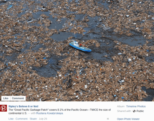 Aktivisten halfen, die Geschichte zu verbreiten, indem sie Fotos der Müll Patches zeigen, in der Regel Bilder von Küstengebieten (nicht im weiten Ozean) – oft nach einem Sturm oder einem anderen Ereignis das Abfall und Schutt ins Meer gespült hat. Das Foto oben wurde in Wakuya nach dem Tohoku-Erdbeben 2011 aufgenommen. Das Foto ganz oben ist in “Lies You’ve Been Told About the Pacific Garbage Patch” [Lügen die Ihnen über den Pazifik Müll erzählt wurden] von Annalee Newitz bei io9, May 2012.