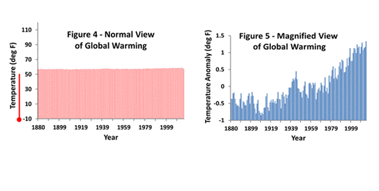 4. Um Temperaturanomalien zu erzeugen, verwendet NASA GISS Temperaturen der realen Welt und subtrahiert eine subjektive „best Estimate des globalen Mittels der Jahre 1951 bis 1980“, welches mit 14°C berechnet wurde. Die Temperaturänderungen (ΔT) für beide Graphiken sind die Gleichen, weil sich ein Graph vom anderen durch die konstante Zahl von 14°C unterscheidet.
