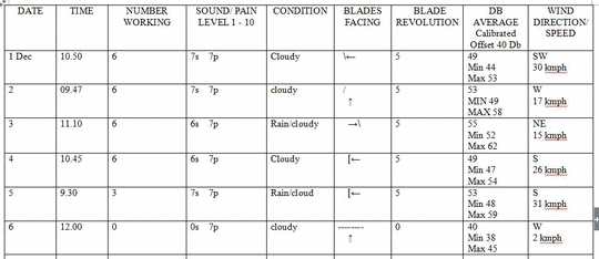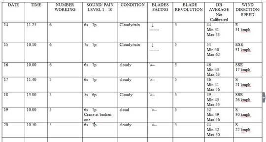 5. Dezember: Ohrensausen, Kopfschmerzen, juckende Haut, tränende Augen, die sich immer noch erholen vom LFN-Krach am Vortag. 3 Turbinen stehen derzeit still. Industrieller Lärm folgt; es könnte schlimmer sein, wenn alle 6 Turbinen laufen würden.