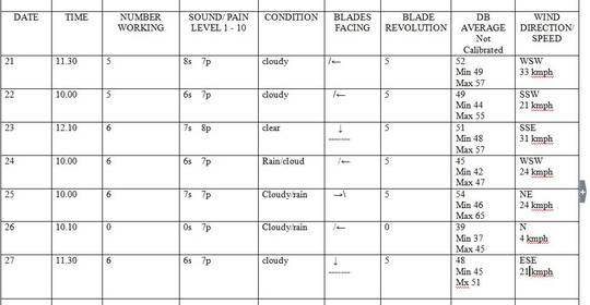 11. Dezember: Eine weitere Nacht mit Summen/Brummen. Obwohl ich Radio mit Kopfhörer hörte, war dieser Lärm immer noch zu hören. Heute hört man ihn drinnen und draußen, immer dieser Lärm wie von einem Luftschiff. Die Rotorblätter sind es, die diesen Lärm erzeugen, mit Kopfschmerzen, Ohrensausen, brennenden Augen, juckende Haut. Ich weiß jetzt schon, dass heute wieder ein schlimmer Tag wird.