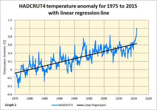 Graphik 2 zeigt die monatliche Temperatur-Anomalie nach HadCRUT4 von 1975 bis 2015. Ebenfalls eingezeichnet ist eine lineare Regressionslinie über den gleichen Zeitraum. Die Neigung der Regressionslinie beträgt 0,0175°C pro Jahr. Die Gesamterwärmung von 1975 bis 2015 beträgt fast 0,72°C.