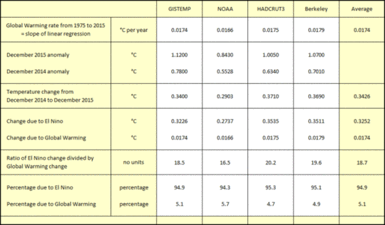Dies bedeutet, dass die Temperaturänderung aufgrund des El Nino über 20 mal größer war als die Temperaturänderung aufgrund der Globalen Erwärmung (siehe Berechnung 3). Mit anderen Worten, El Nino war für über 95% der Temperaturänderung zwischen Ende 2014 und Ende 2015 verantwortlich.