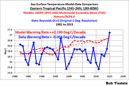 El Nino- und La Nina-Ereignisse wirken sich im östlichen tropischen Pazifik am stärksten aus. Während eines El Nino fließt warmes Oberflächen- und oberflächennahes Wasser entlang des Äquators in den tropischen Ostpazifik, wobei das oberflächennahe Wasser, wärmer als normal, an die Oberfläche aufquillt. Während einer neutralen ENSO-Phase (weder El Nino noch La Nina) und während La Nina-Ereignissen quillt kühles Wasser unter der Oberfläche nach oben. Offensichtlich haben die Klimamodellierer nicht einmal ansatzweise Aspekte des tropischen Pazifiks erfasst. Während es den Daten zufolge im östlichen tropischen Pazifik (24N bis 24S; 180W bis 80W) während der letzten Jahre keine Erwärmung der Oberfläche gegeben hat, zeigt der Konsens der Modelle, dass die Oberfläche sich mit einer Rate von 0,18°C erwärmt haben sollte. Siehe Abbildung 6.