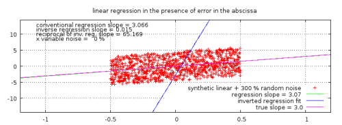 Bei Letzterem können die beiden Regressions-Fits herangezogen werden als Beschränkung des wahrscheinlich wahren Wertes, aber Einiges muss über die relativen Fehler bekannt sein, wenn man entscheidet, wo innerhalb dieser Bandbreite die beste Schätzung liegt. Es gibt eine Anzahl von Verfahren wie etwa die Winkelhalbierung, wobei man das geometrische Mittel (Quadratwurzel des Erzeugten) oder irgendein anderes Mittel betrachtet, aber ultimativ gibt es keine weitere Objektive, es sei denn mittels Wissens um die relativen Fehler. Eindeutig wäre die Halbierung nicht korrekt, falls eine Variable nur einen geringen Fehler aufweist, da die wirkliche Neigung dann nahe dem OLS-Fit liegen würde, die man mit jener Quantität auf der X-Achse durchgeführt hätte.