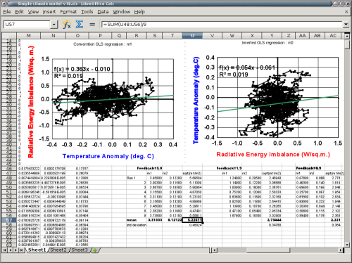 Zweitens ist anzumerken, dass das geometrische Mittel der beiden OLS-Regressionen tatsächlich einen wahren Rückkopplungs-Parameter ergibt, der einigermaßen nahe dem Wert liegt, wie er aus den Satellitenbeobachtungen abgeleitet ist. Variationen sind ziemlich gleichmäßig verteilt auf beiden Seiten: Das Mittel ist nur wenig höher als der wahre Wert, und die Standardabweichung ist etwa 9% des Mittels.