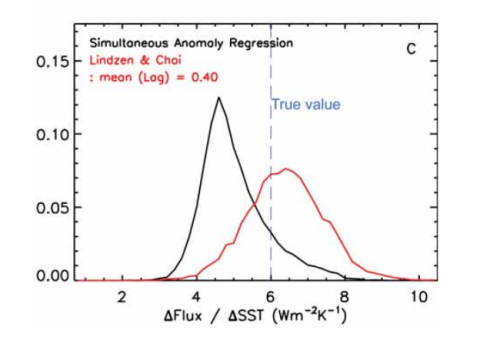 In dem Sinne, dass diese Regression in der Klimatologie konventionellerweise angewendet wird, wird der Gesamt-Rückkopplungs-Faktor unterschätzt werden. Da die Klimasensitivität definiert ist als das Reziprok dieses Terms ist dieses Ergebnis eine Überschätzung der Klimasensitivität.
