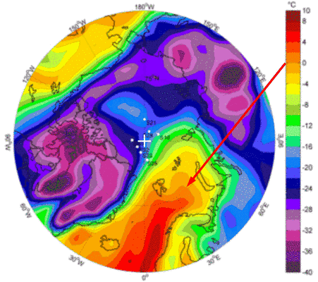 Bild 4, Oberflächentemperatur am 30. Dezember 2015 (Daten: NCEP/NCAR Reanalysedaten www.esrl.noaa.gov/psd/products). Weiße Punkte sind AWI-Messboyen. Zufügung: Der rote Pfeil kennzeichnet die 0 Grad Grenze, das weiße Kreuz den Nordpol.