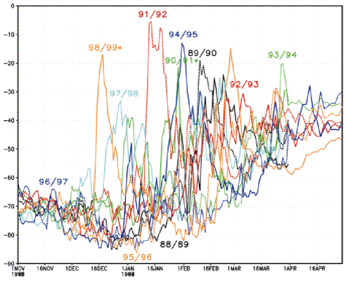 Bild 5, Abb. 2 Zeitreihen von täglichen 10-hPa-Temperaturen (°C) am Nordpol von November bis April, für die 11 Winter von 1988/89 bis 1998/99. (Daten: Institut für Meteorologie, Freie Universität Berlin)