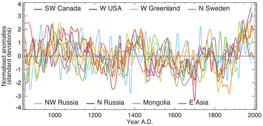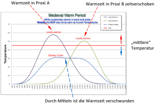 Alternativaussage: Oder der Klimaverlauf wäre wirklich so lokal begrenzt wie es verschieden Proxis angeben – womit es dann aber nirgends einen globalen, nicht einmal einen großflächig einheitlichen Klimaverlauf geben würde.