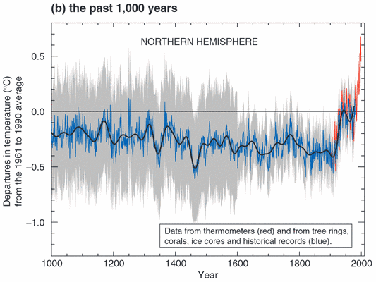 Quelle: IPCC Report AR2 von 2001, Figure 1: Variations of the Earth’s surface temperature over the last millennium.