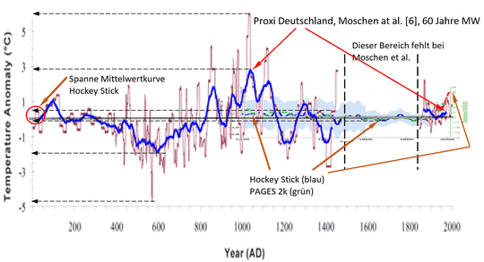 Um die Problematik zu zeigen, hat der Autor die Hockey-Stick-Kurve und PAGES 2k Projektion auf ein Proxi von Deutschland[6] gelegt (Bild 4). Die Temperaturvariabilität unterscheidet sich mit einem Faktor nahe 10 um eine ganze Größenordnung. Man beachte auch den Unterschied im Jahr 2000.