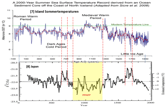 Quellen: [7] Sicre at al. 2008: Decadal variability of sea surface temperatures off North Iceland over the last 2000 years. Earth and Planetary Science Letters 268: 137-142. Quelle: Co2Science. [8] Kitagawa at al., Japan, Quelle: Co2Science.
