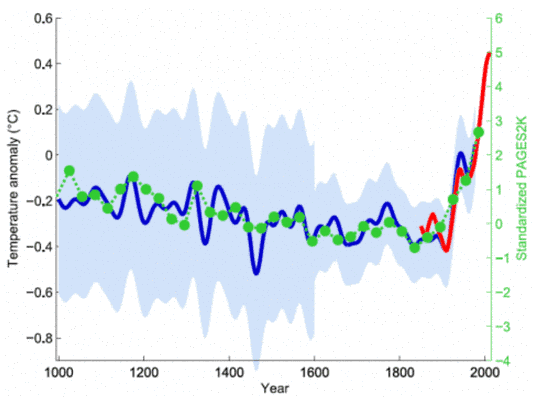 Vorige Woche haben wir hier die neue Klimarekonstruktion des PAGES 2k-Projekts besprochen, die einmal mehr den Hockeyschläger-Verlauf der Klimageschichte der letzten tausend Jahre bestätigt hat.